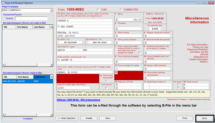 Then, choose the payer/company from the Payer/Company dropdown. This will open a new window; select the recipient/payee from the bottom window to edit the relevant recipient’s tax form. Make the necessary changes to the data. When you’re finished, click Save.
